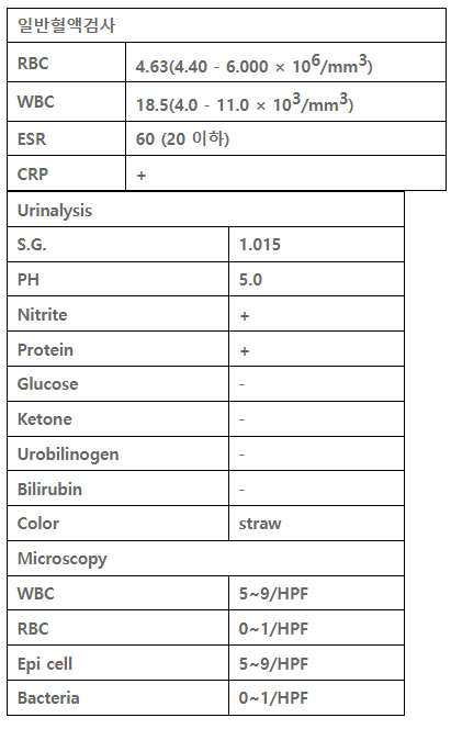 진단을 위해서 관련 검사를 시행하였다. 일반혈액검사, 소변검사를 시행하였다. 상기 환자가 시행한 검사 결과는 다음과 같다.