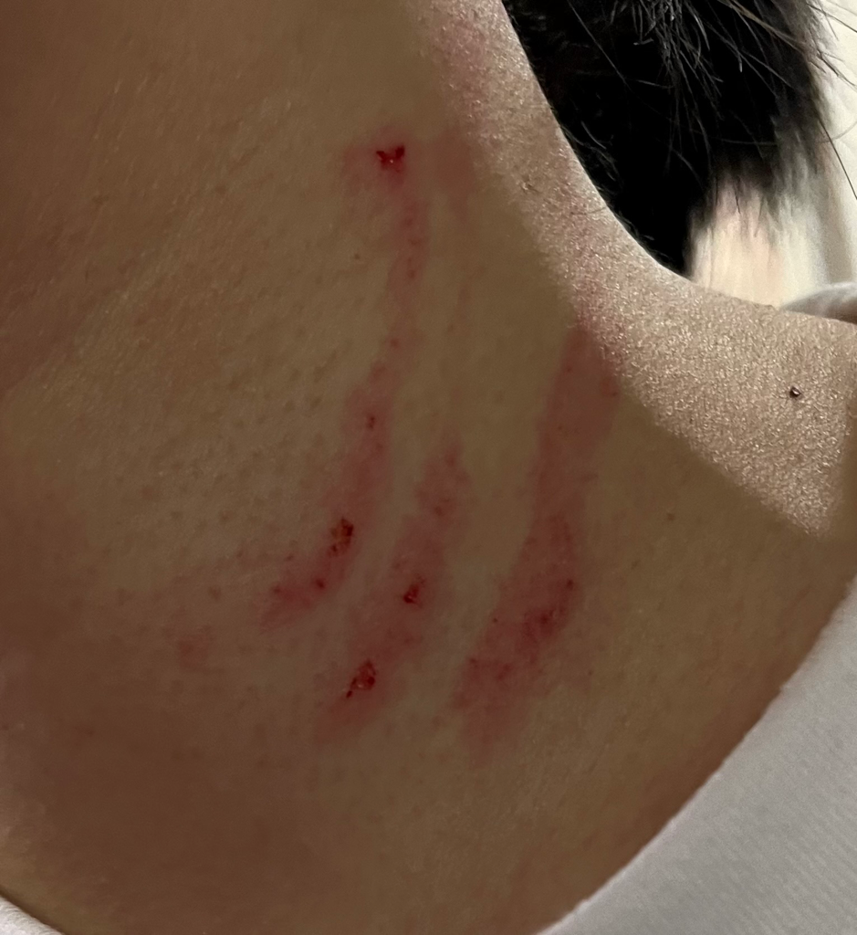피의자가 1.5센치정도 되는 긴 손톱으로 목을 뜯어놔서 6군데에 상처가 생겼고 상해2주 나왔습니다 흉터제거치료 받아야 하는 상태고 오른쪽 목에는 엄지손톱으로 찍어눌러서 더 깊은 흉터 있습니다