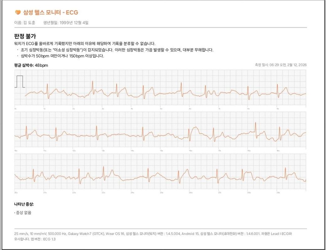 심전도가 흔들리면 확인이 어렵답니다. 물론 맥박자체가 중간에 한번씩 건너 뛰는 것은 보이는 것 같아요. 조기수축 아닐까 싶은데요. 음주나 카페인 섭취, 스트레스 처럼 맥박이 빨라질 때 더 자주 나타날수 있으니 가급적 피하는 것이 좋지요.