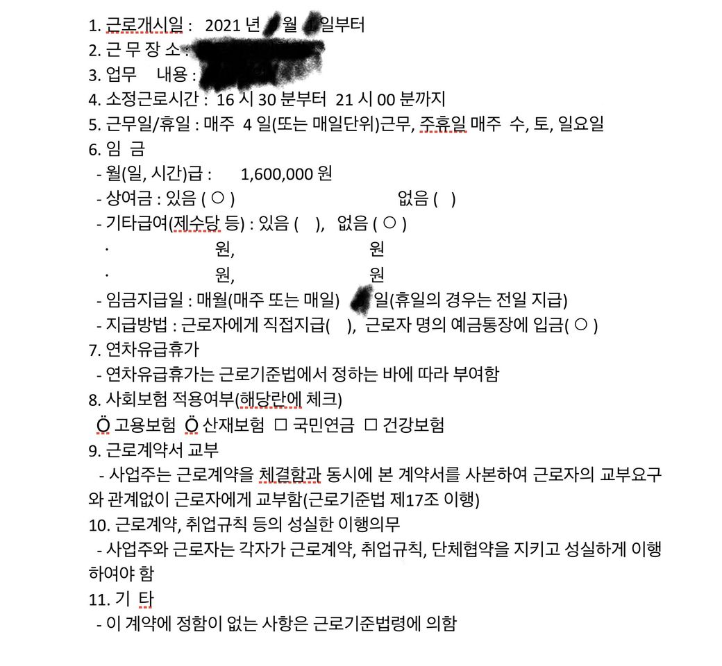1. 근로계약서에는 주4일, 매일 4.5시간 근무가 포함되어 있습니다.
