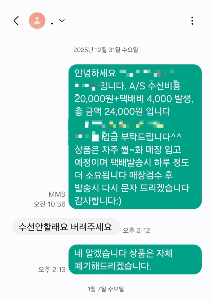 아래 내용처럼 AS맡겨주신 고객님의 번호를 잘못 기입하여 수선 안내문자를 보냈고,
