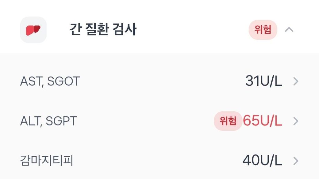 ALT 65는 경도 상승 범위로, B형 간염 보유자라면 약간의 주의가 필요한 수치입니다. 음주량이 아주 많은 편은 아니지만, 간염 + 음주 + 장기간 미추적 상태가 겹치면 이런 정도의 상승은 종종 보입니다. 급성 악화 소견으로 단정하긴 어렵지만, 6년간 검사를 안 받으셨다면 정밀 평가가 필요합니다.