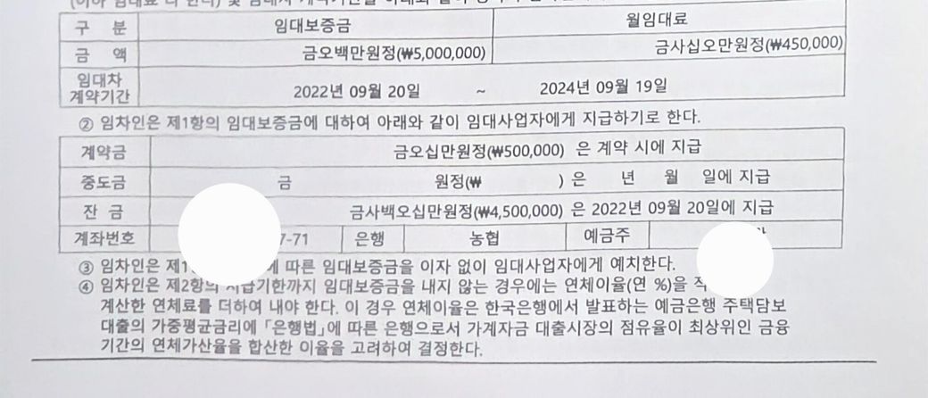 2022.9월 20일 450만원 보증금 입금