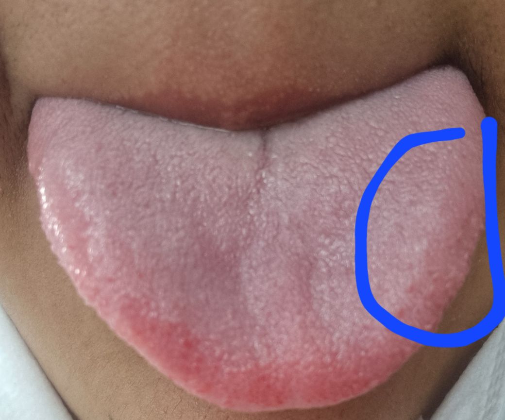 우측 측면에 동그라미친 구간인 혀가 부은거같습니다 종양인지 걱정이네요 기저질환도 없고 가끔 이빨에 걸리곤 합니다 약간 굳은살같이 만져지긴한데 부분에 미각은 느껴지고요