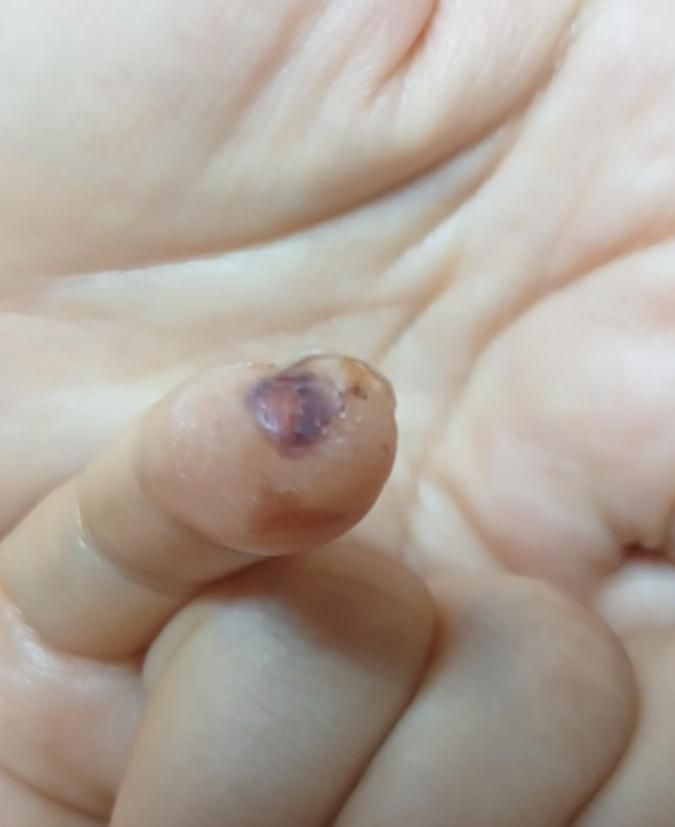 올려주신 내용은 잘 읽어보았습니다. 손가락을 꿰맨 부위로 실밥을 제거한 상태로 보입니다. 며칠 간은 마데카솔 같은 연고를 발라주면서 경과를 지켜보시길 바라며, 진물이나 출혈 등은 없는지 확인해보시길 바랍니다. 상처가 제대로 아물었다면 연고를 계속 바를 필요는 없어보입니다.