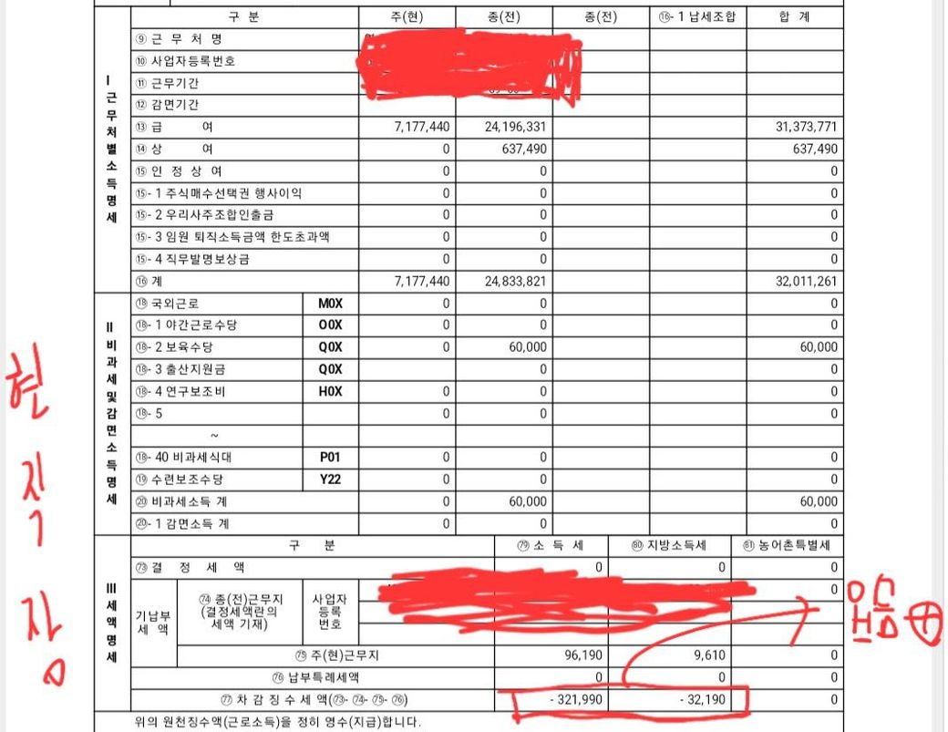 연말정산, 전직장 원원천징수영수상 차감징수세액 문의
