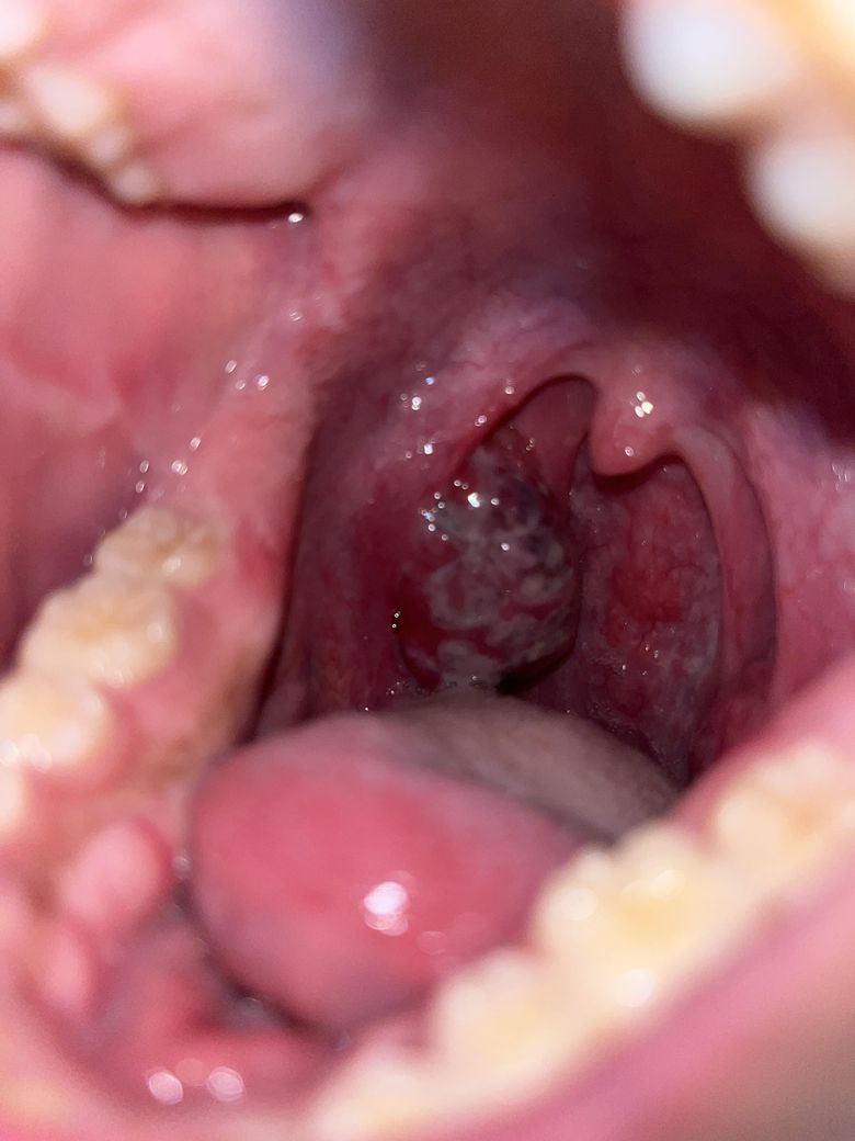 현재 증상 - 열(고열은아님) , 항생제 때문인지 속이 메스꺼럽고 안좋음 , 침 삼킬 때 림프선을 누르고 있는 큰 편도때문에 통증, 편도에 검붉게 출혈흔적 지금은 하얗게 염증(?)같은게 덮어버림