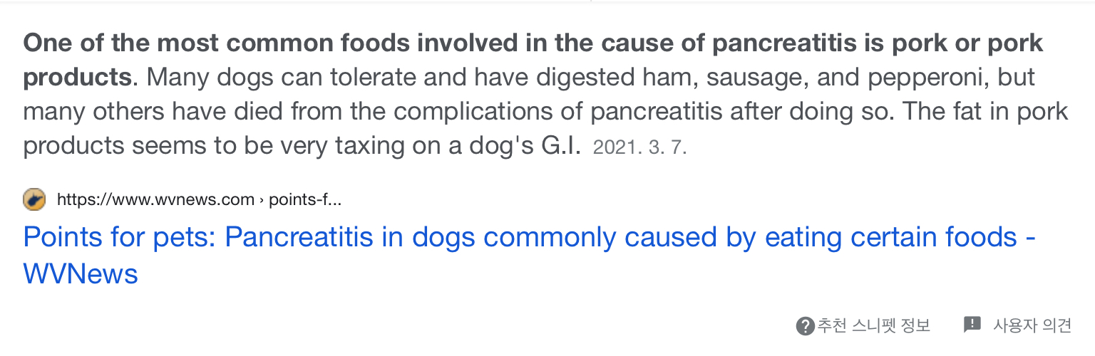 돼지고기는 개에서 췌장염을 유발하는 상당히 주요한 음식물로서 익히든 익히지 않았건간의 상태를 떠나 추천하지 않습니다.