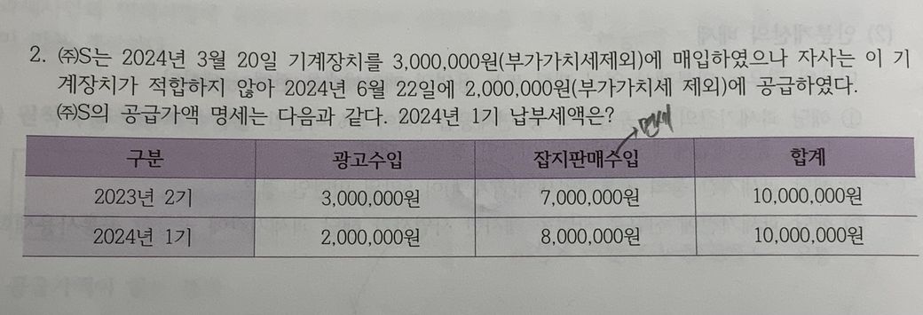 기재하신 것처럼 안분한 금액과 광고수입을 반영한 부가가치세는 26만원입니다. 문제를 잘 읽어보시길 바랍니다. 24년 1기 납부세액을 구하는 문제입니다.