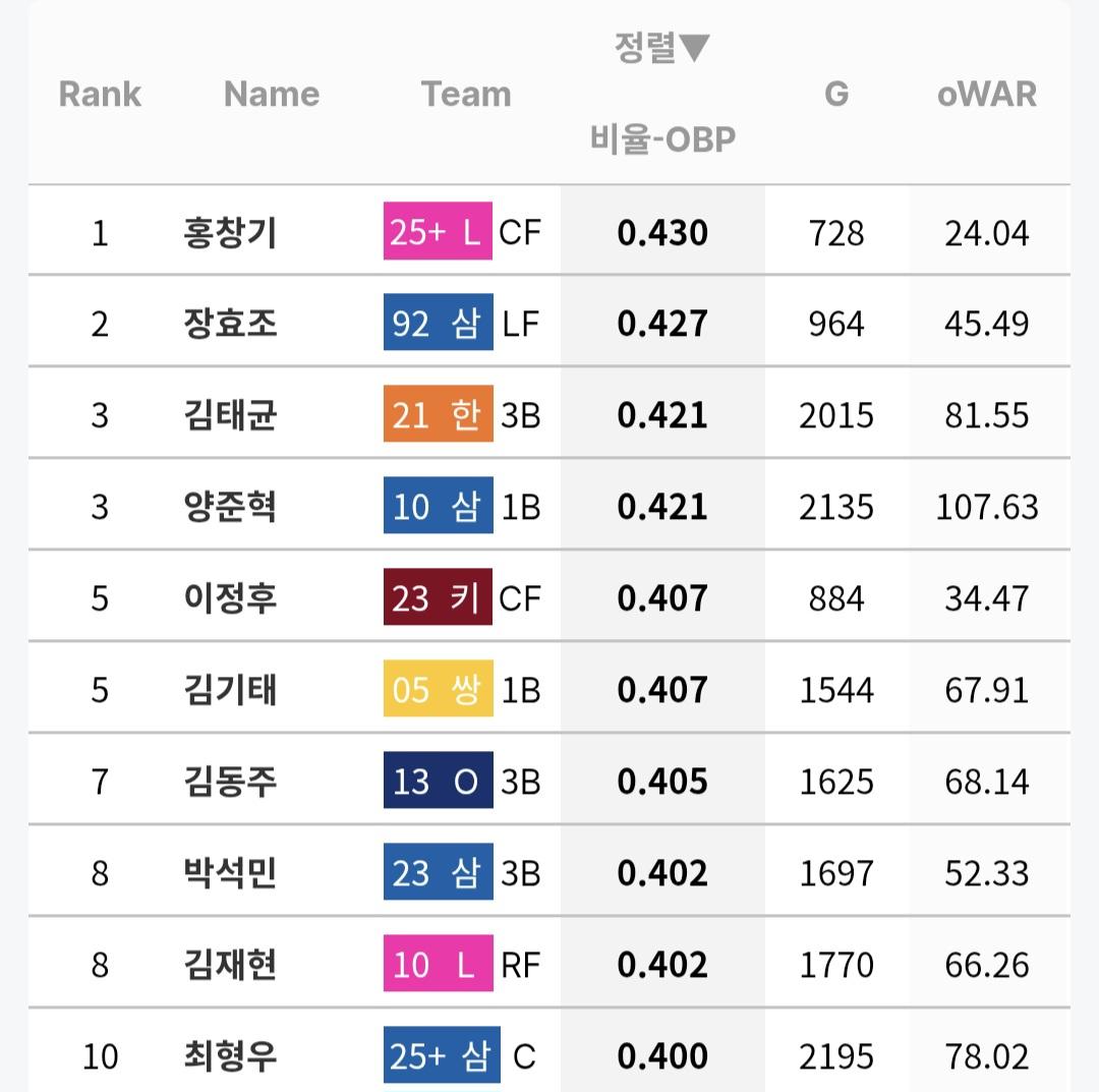 비율 스탯은 이후의 성적에 따라서 과거 선수에게도 역전 당할 가능성도 있으나 현재로서는 홍창기가 여전히 1위입니다.