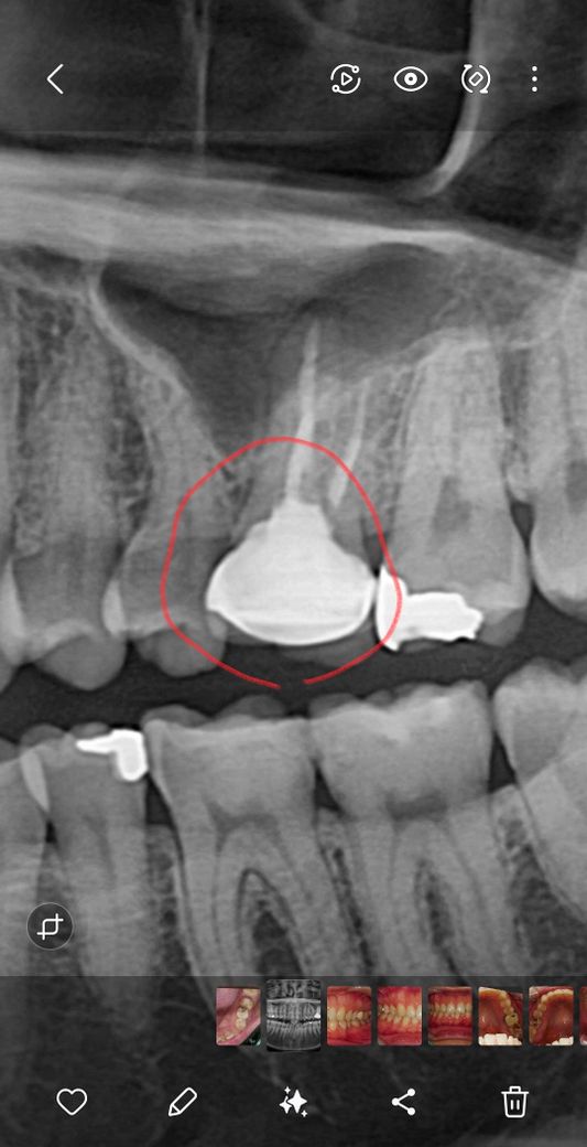 크라운 전 신경치료를 한 것입니다. 신경치료 마무리 단계에서 깨끗이 소독한 신경관을 치과용 재료로 채워넣은 것이고 방사선 불투과성 재료이므로 저렇게 엑스레이상에서 보입니다.