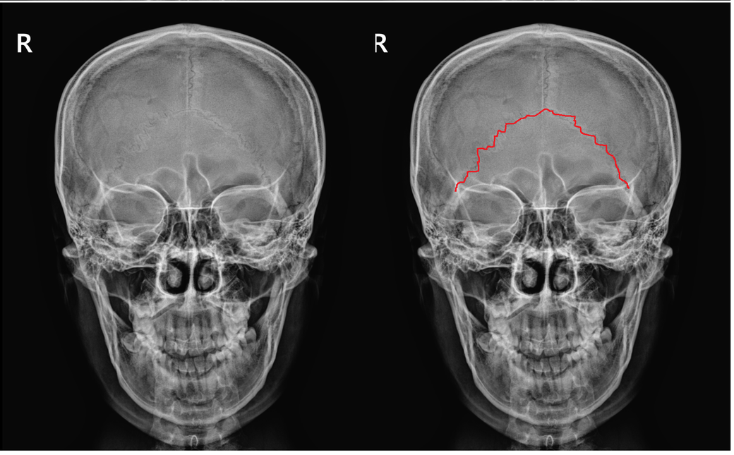 아래 그림의 오른쪽 그림 보시면 두정골과 후두골이 만나는 부위를 보실 수 있을겁니다. 이게 전면부에서 보면 작성자분이 올려주신 X-ray와 같이 삼각형 모양으로 보일 수 있습니다. 작성자분이 표현하셨듯이 투과되어서 앞에서 삼각형으로 보이는겁니다.