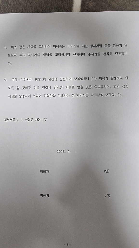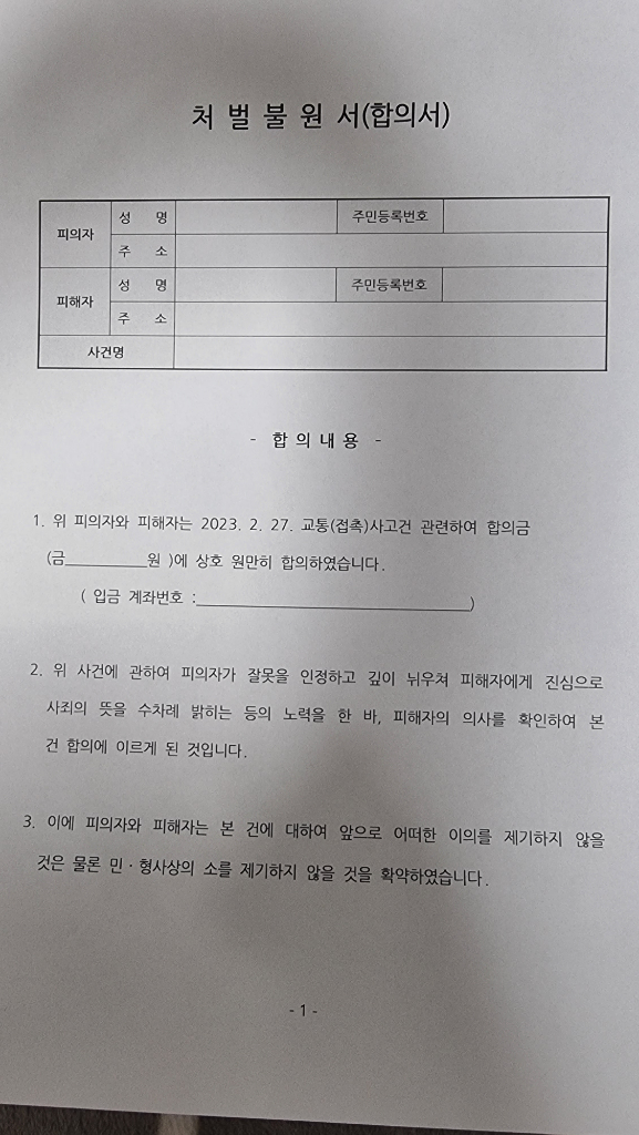 과속으로 인한 형사 합의인 경우 위 형사 합의서를 쓰고 합의하면 됩니다.