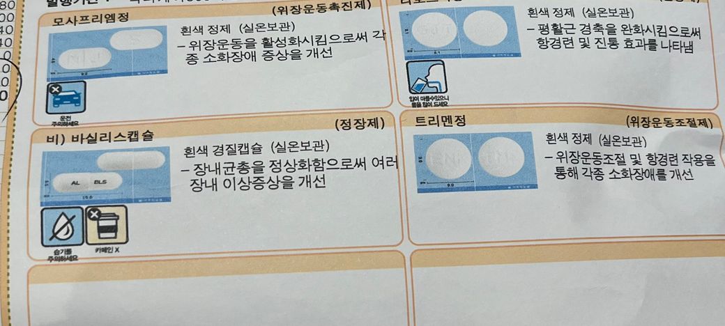 약 중에서 그 확률이 낮긴 하지만, 경우에 따라서는 말씀하신 것처럼 속을 울렁거리게 하고 두통을 부작용으로 일으킬 수 있는 약이 있습니다. 모사프리엠정이 그러할 수 있으니, 해당 약을 제외하고 약을 우선 복용해보시도록 하는 것이 좋겠습니다.