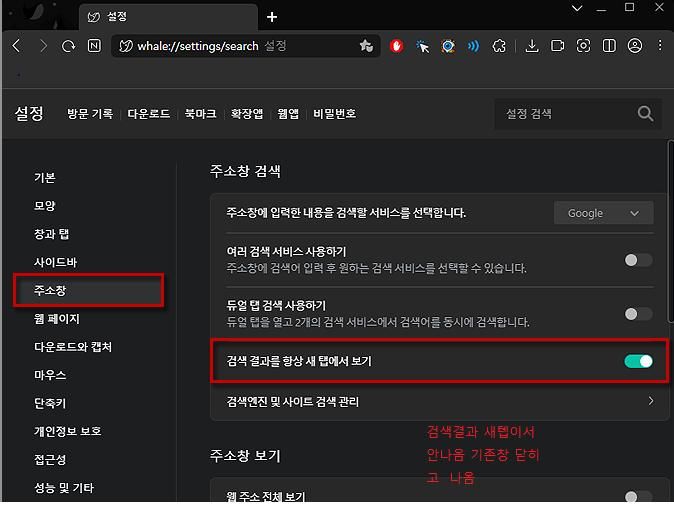 네이버에서 주소창에서 새창열기 설정했는데..먹히지 않습니다..검색시