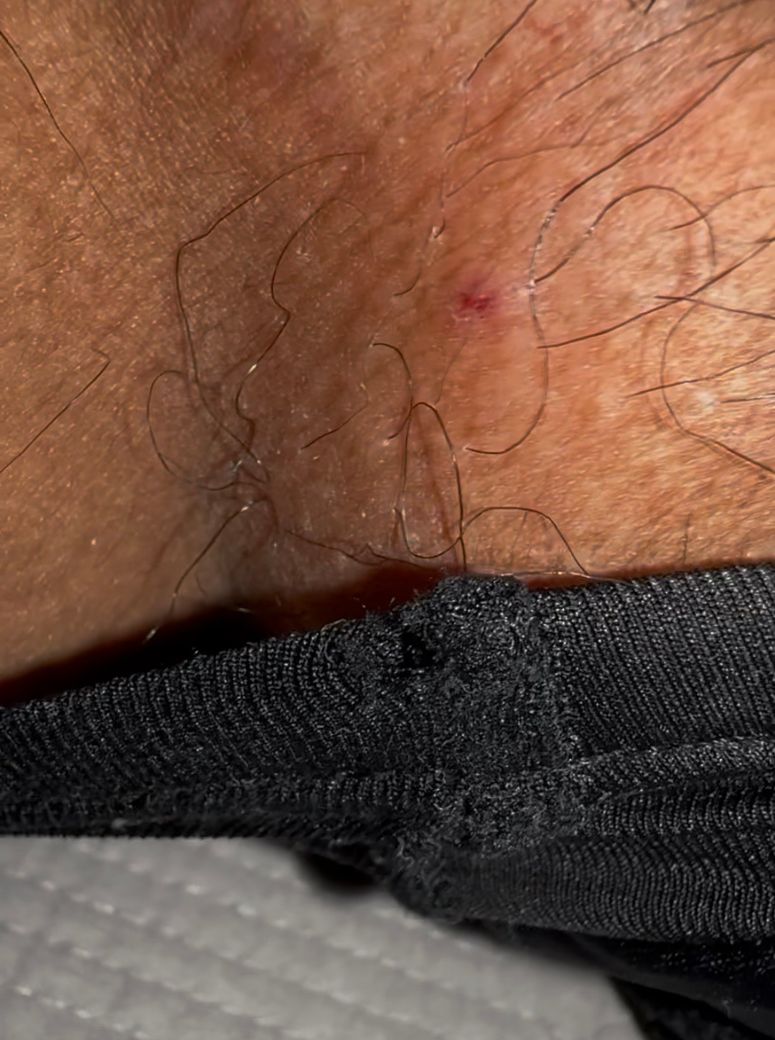 사진의 소견을 놓고 구체적으로 어떠한 원인에 의한 병변이고 어떠한 질병이 있다 하는 식의 평가는 가능하지 않습니다. 다만 모낭염 같은 문제가 있은 이후에 터지고 나서 남은 상처 같아 보이는 양상의 소견입니다. 연고를 잘 발라주고 관리하면 스스로 호전될 가능성이 높아 보입니다. 반복적으로 재발하거나 점점 증상이 악화되는 양상을 보이는 등 전형적이지 않은 경과를 보일 경우에는 구체적으로 진료 및 치료를 받아보는 것이 적절하겠습니다.