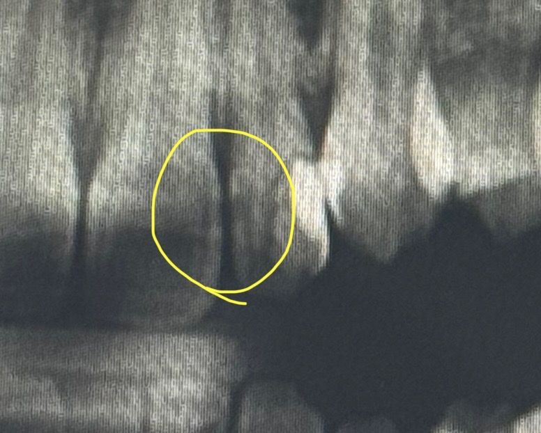 치아 엑스레이 사진 속 노란 동그라미 표시한 부분이 충치일까요?? -> 충치 가능성이 있어보입니다 해당 부위는 앞니 사이로 충치가 잘 생기는 부위이기도 합니다