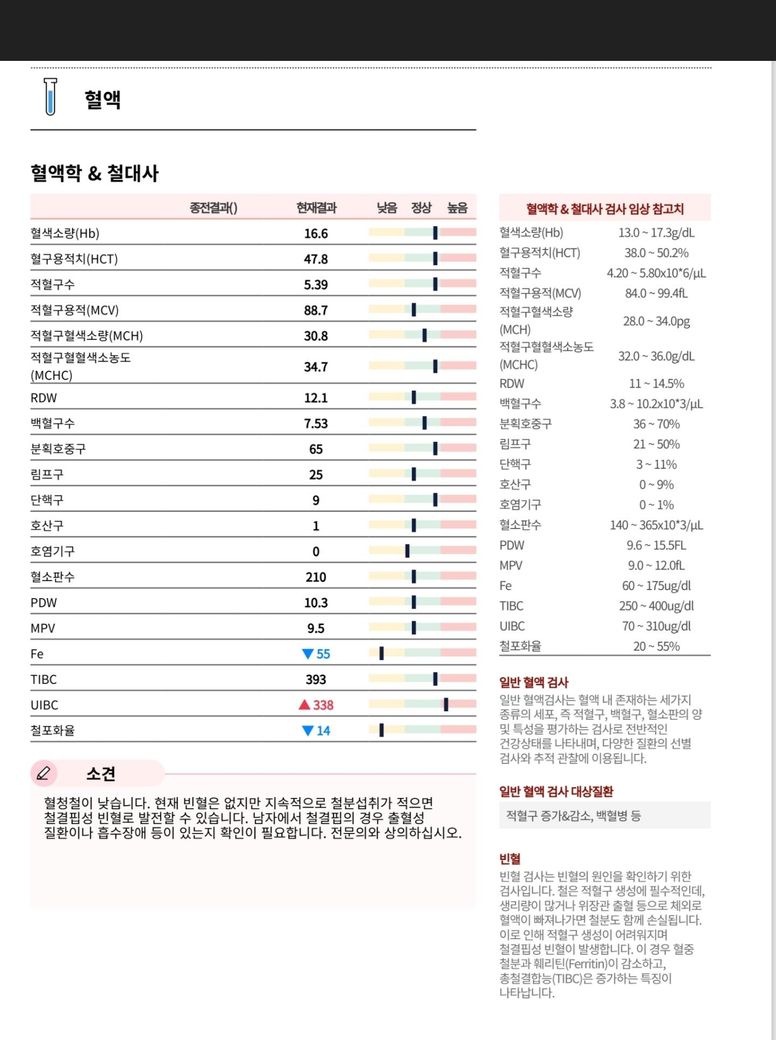 혈청 철의 경우는 낮다고 해서 특별한 검사를 필요로 하지는 않습니다. 보통 확인을 하는 이유는 빈혈 때문인데