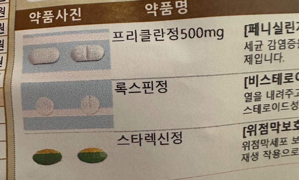 현재 처음사진의 통증약과 항생제 성분은 같이 복용이 가능한 성분은 맞으나 록스핀정은 첫번째 사진의 에이서정의 소염진통제 성분과 계열이 겹치기 때문에 록스핀정은 빼고 복용하시는걸 권해드립니다.