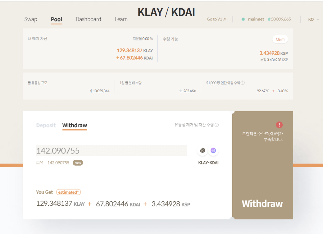 클레이스왑에서 예치해놓은 코인들 찾으려고 하는데 왜 요청실패로 뜰까요?