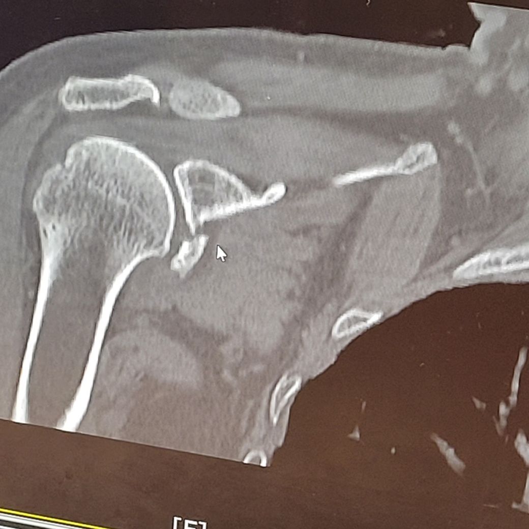 현재 견갑골의 관절와 부분의 골절이 있으신것 같습니다.