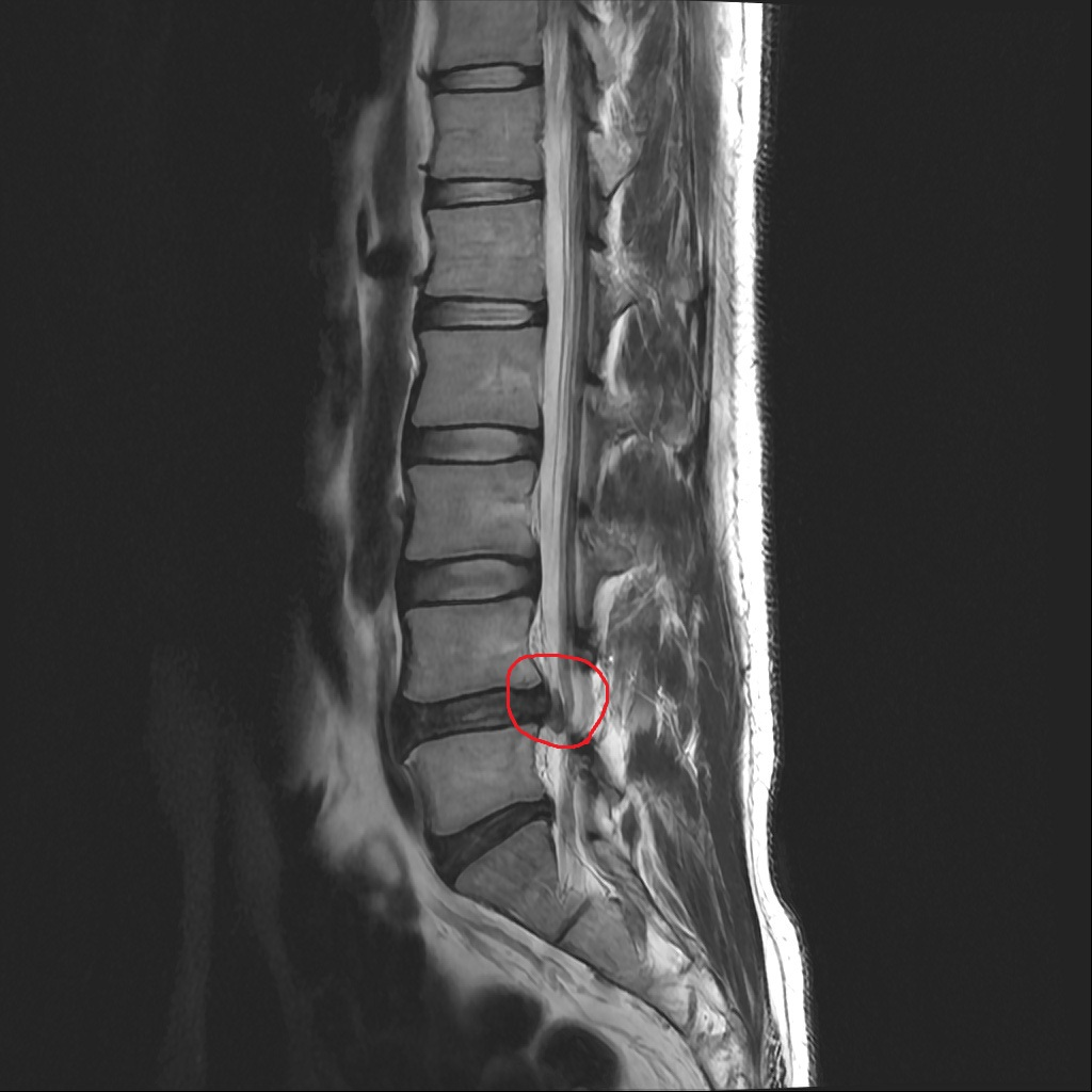 수핵의 탈출, 신경의 눌림이 저명하게 관찰되고 있습니다. 붉은 색으로 표시하신 부분에 해당합니다.