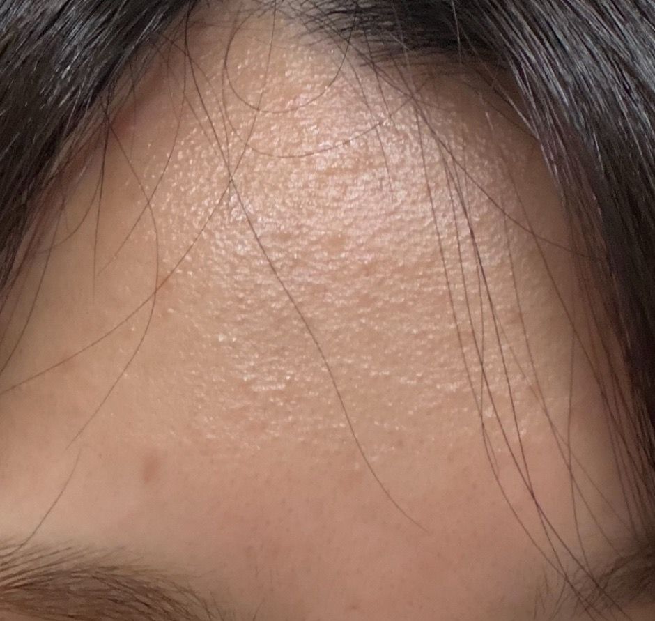 사진상 이마 전반에 균일하게 작은 돌기들이 분포해 있고, 염증성 여드름보다는 피부결이 거칠어 보이는 양상입니다. 일부는 폐쇄면포(whitehead, 좁쌀여드름)에 해당할 가능성이 높고, 나머지는 각질 축적과 피지 분비 증가로 인한 미세 면포 단계로 보입니다. 즉, 대부분은 좁쌀여드름 범주로 볼 수 있습니다.