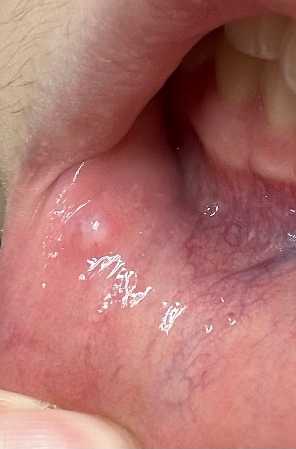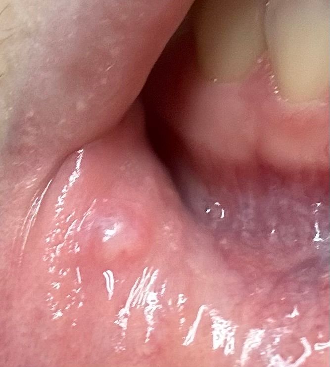 입안에 수포처럼 투명하게 물집이 잡혔는데 구내염은 아닌 것 같고 뭔가요..? 며칠전에 구내염 있어서 알보칠 발라서 가라앉는 중인데 갑자기 뭐가 만져지더니 수포처럼 투명하게 볼록한 뭔가가 생겼어요