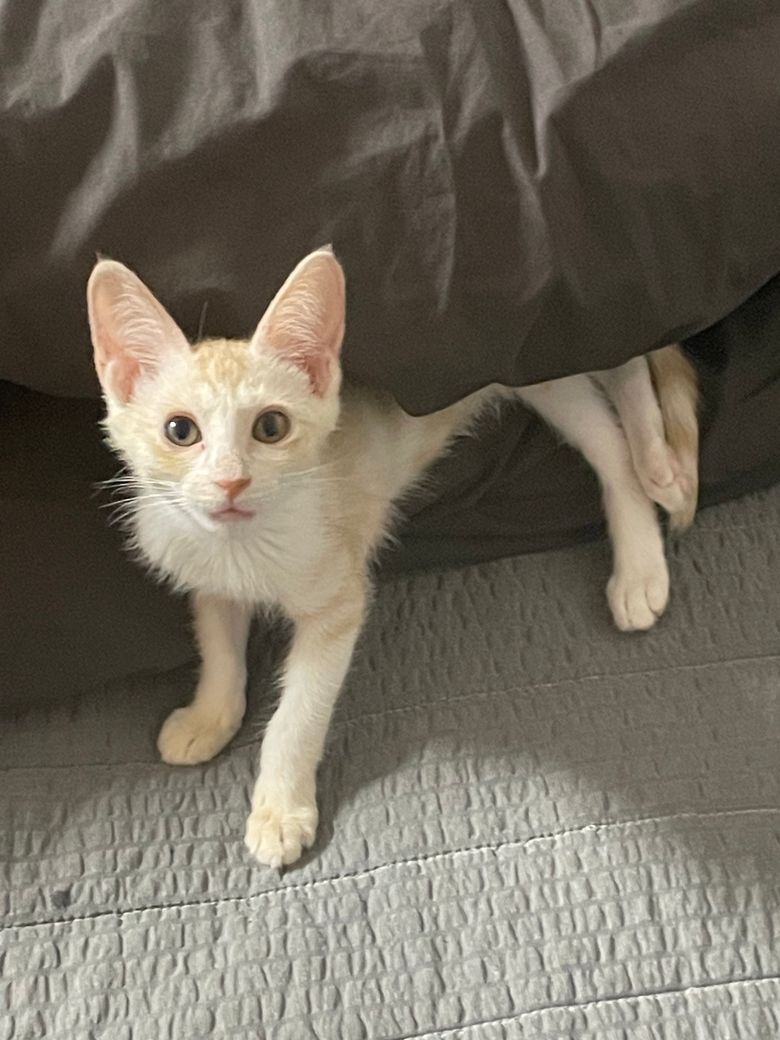3개월 조금 덜 된 여아입니다. 길냥이 출신 코숏인데 일반적인 치즈태비랑은 등줄기 무늬가 확연히 다르고 특히 귀가 아주 많이 큽니다.