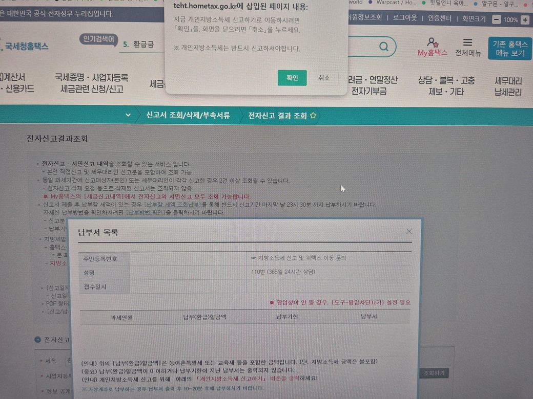 종합 소득세 신고 모두 마쳤습니다. 납부해야 할 세금이 107만원 정도 조회돼요. 지방세도 이미 납부했습니다. 그런데 조회된 세금이 아무리 납부를 할려고 해도 납부 버튼이 보이지가 않습니다. 신고는 이미 다 한 상태예요. 어떻게 해야 하나요? 세무서에가 가지고 납부를 해야 할까요? 날짜가 얼마 남지 않았는데 도움이 필요합니다