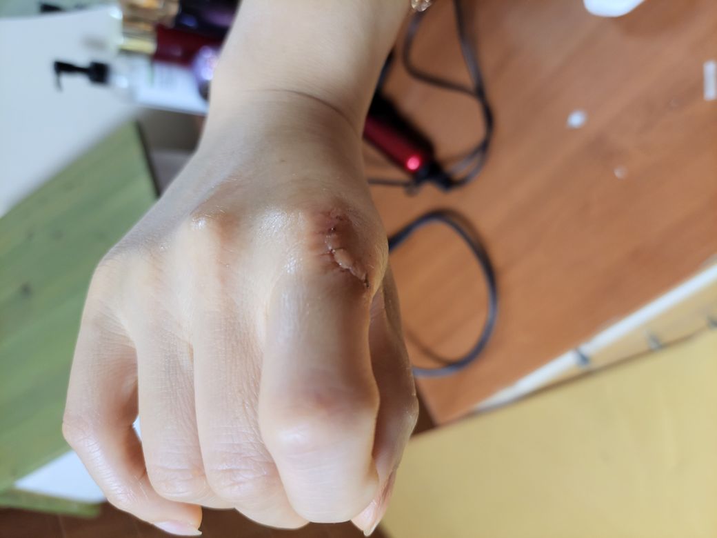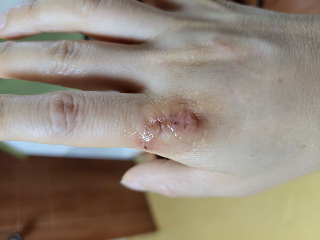 우선은 연고를 바르시면서 경과관찰이 가능할것으로 보이며, 정확한 상태파악을 위해 가까운 정형외과 또는 성형외과에 내원하시어 진료를 받아보시는 것이 좋겠습니다.