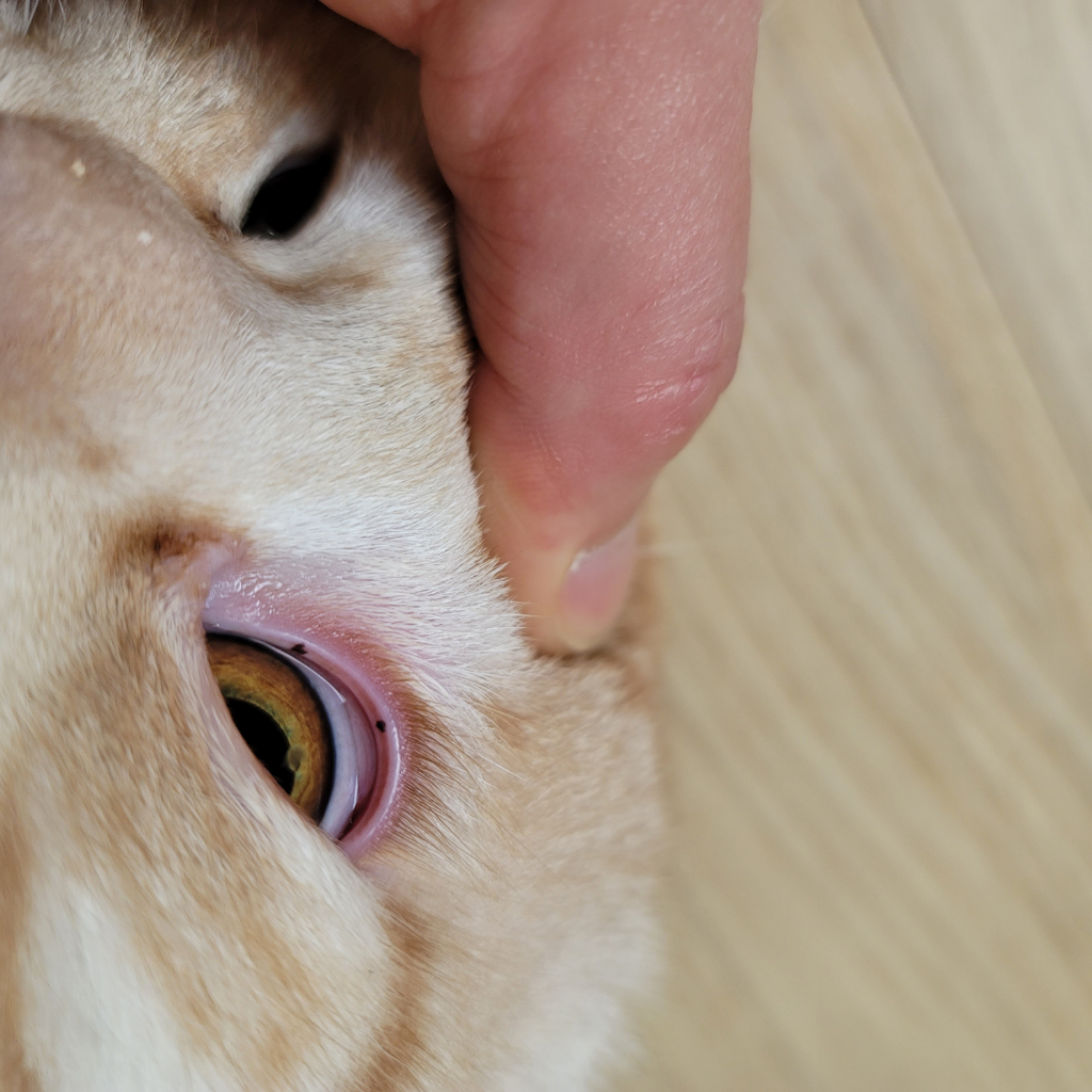 안구증상이 지속, 심화된다면 동물병원에 데려가 검진을 받아보세요.