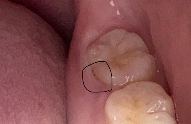 현재 사진으로는 정확히 알 수 없습니다. 치석 및 치태일 가능성도 있고, 치아가 착색되었을 수 있습니다. 또한 충치 부위가 해당 부위에 생겼을 수 있습니다. 지금으로서는 치과 방문 후 어떠한 것인지에 대한 평가를 받아보는 것이 필요하므로 다다음주 치과 방문 후 체크를 해보시길 바랍니다.