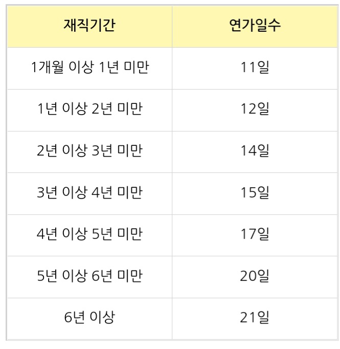 그리고, 만 3년차부터는 2년마다 1일씩의 가산휴가가 발생하여, 연간 최대 25일의 연차유급휴가가 발생할 수 있습니다. (만 1년: 15일, 만 2년: 15일, 만 3년: 16일, 만 4년: 16일, 만 5년: 17일 등)