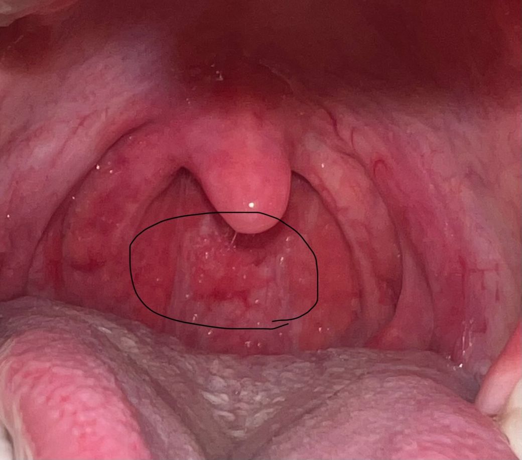 표시하신 부위는 해부학적으로는 구인두 뒷벽이며 울퉁불퉁한건 인두 과립(pharyngeal granules)이라고 하는 구조입니다.