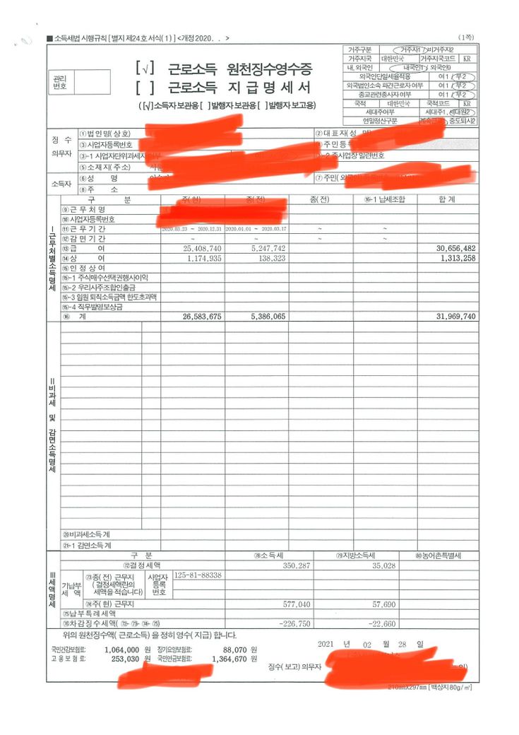 중소기업 소득세 감면 신청했으나 감면금액이 없다고 합니다+ 원천징수영수증 첨부