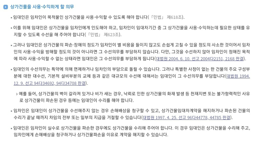 상가건물 임대차보호법 상 규정과 민법상의 규정에 의하면 임대인은 임차인이 임대차목적물을 온전히 사용ㆍ수익케 할 책임과 의무를 집니다..상가건물의 수선의무도 임대인이 지고 있습니다.