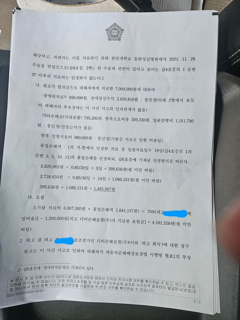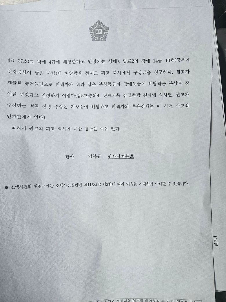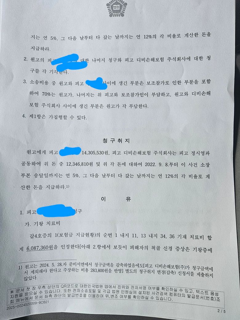 맨 첫번째에 피고와 더불어 가려져 있는 부분이 본인을 지칭한다면 본인이 410만원을 보험사와 관계없이 원고에게 지급해야 한다는 취지이며 원고가 당초 청구한 나머지 부분에 대해서만 기각했다는 것이고 위 제1항 기재 금원은 지급해야 한다고 인용한 것이 해당 판결의 취지라고 볼 수 있습니다. 이상입니다