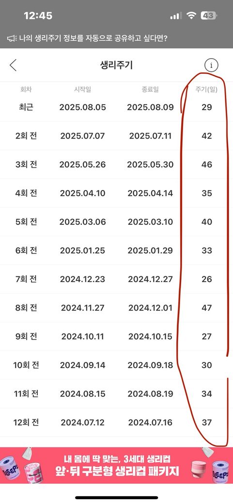 근데 문득 궁금해서 그 동안 저장해놓은 걸 보니 주기가 아무리 들쑥날쑥이여도 이럴 수 있나 싶어서요 ㅋㅋㅋ
