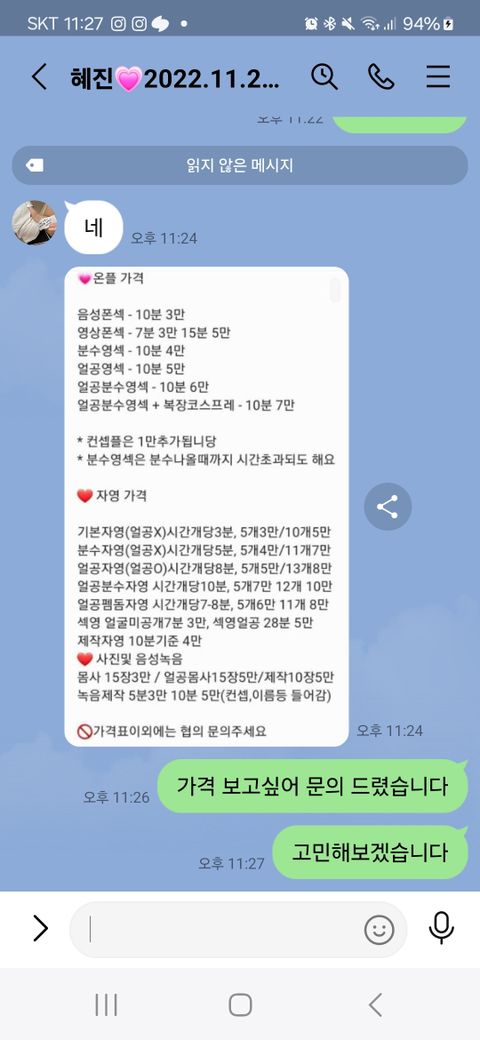 저는 성적 호기심이 제가 트윗을 보다가 가격표가 궁금해 불어봤습니다 그 후 저는 가격표만 보고 고민하고 다시 오겠다고 말을 돌리고 라인을 안했습니다 저 고소 당하는거 아니죠?