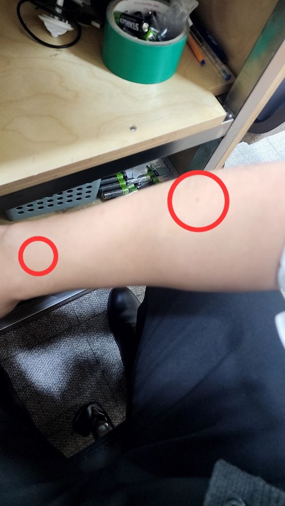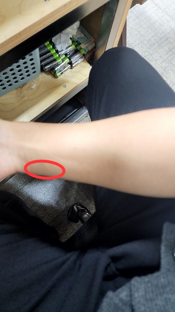 그리고 손바닥 쪽으로 뒤집은 뒤 손목 밑 왼쪽부분 근육을 누르면 거기가 통증이 제일 심합니다.