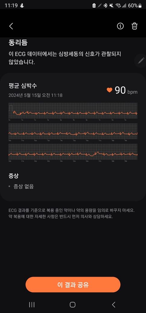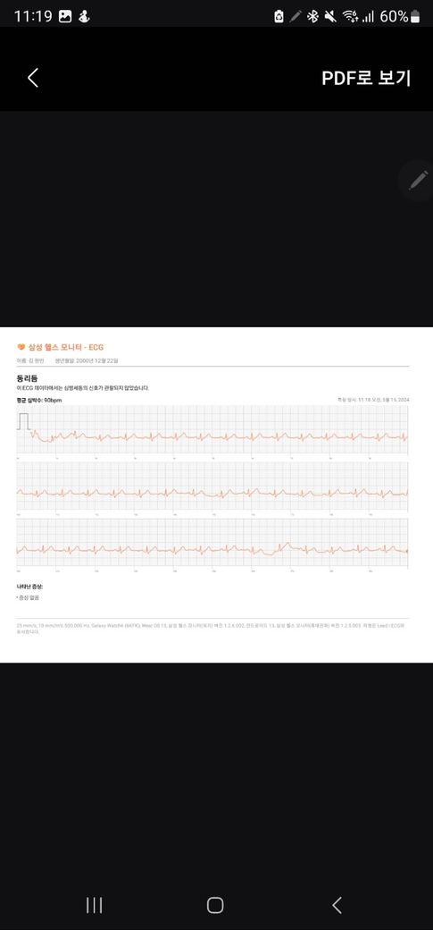 올려주신 워치 심전도는 특별한 이상은 없어 보입니다.
