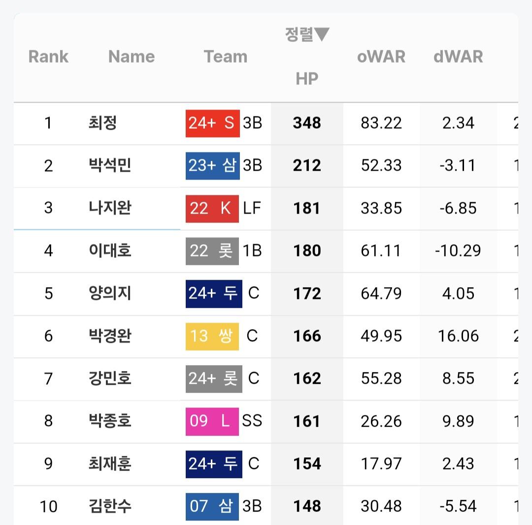 1위는 SSG의 최정으로 348개를 기록했습니다.