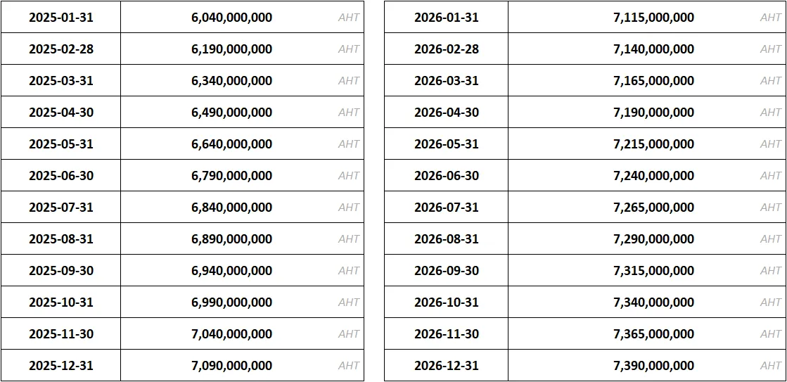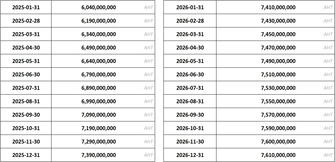 월별로 기재된 수치는 실제 유통량 및 실제 확정 공급 계획을 의미하지 않습니다. 해당 월말 기준 최대로 유통될 수 있는 아하 토큰 유통량에 대한 예상 내용입니다. 실제 유통량은 월별로 기재된 수치보다 적게 유통될 수 있습니다. 결론적으로 월별로 기재된 해당 수치를 초과하는 유통량 공급은 실제로 어떠한 경우에도 진행되지 않습니다.