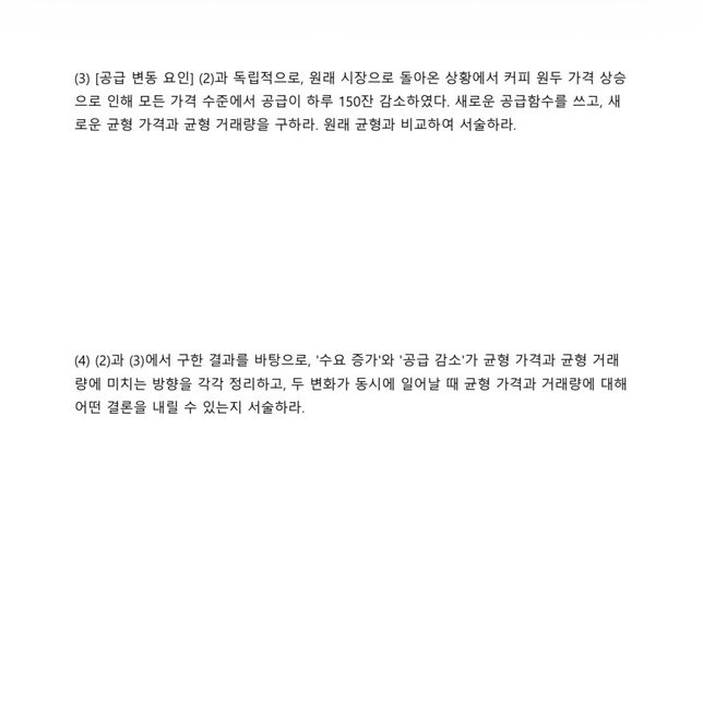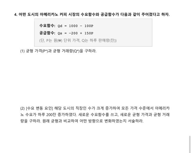 (4)에 대해 질문이 있습니다 수요 증가로 균형거래량이 520->640잔이 되고공급감소로 균형거래량이 520->460잔이 되는 변화가 동시에 일어난다명 균형거래량은 증가하나요?아니면 알수 없다가 답인가요?