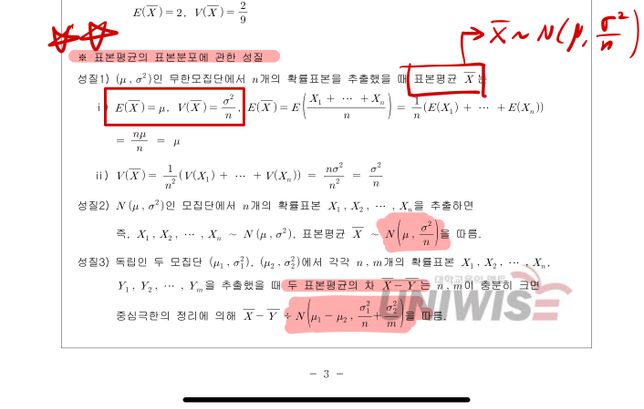 모집단이 있는데, 표본을 뽑아서 분산을 구할때는 n 으로 나누는게 아니라 n-1로 나눠야 한다고 배우고 이해했습니다. 그런데 자료를 공부하던 중 이미지와 같이 표본분산 V(X) = 시그마(제곱) / n 으로 적혀있더라고요. 저게 n 말고 n-1이 되어야 하는거 아닌가요? 이게