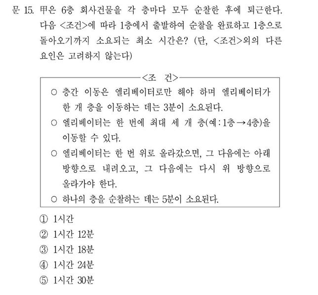 행정고시 상황판단 1문제 푸는데 걸리는 시간이 1분 37초면 늦은 건가요?제가 푼 문제는 사진에 있습니다. 저는 어떻게 풀었냐면 해설보니까 아주 엄청나게 복잡하고 길던데 그냥 직관적이고 빠르게 풀었습니다. 한 개 층 이동에 3분이면 총 6층이니까 3의 6제곱 18분이고 하나의 층을 순찰하는데 총 5분이 걸린다는 건데 18+5분 = 23즉 1시간 18분임을 직관적으로 알 수 있죠.