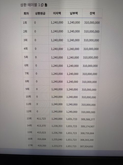 - 대출경제신통한악어147원리금 균등 상환 거치 기간 포함해서 계산한 표 입니다 맞나요?자서 하고 왔습니다 집에 와서 상환표 보니 인터넷에서 직접 입력한 값이랑 다른데 제가 잘 맞게 받은 게 맞나요?인터넷에 표는 회차가 거듭날수록 원금이 점점 늘어나는데 저는 뒤죽박죽이에요두 표가 월 상환금액은 같게 나오구요상환 원금과 상환 이자가 다르네요첫번째사진이 자서, 밑에사진이 인터넷표 입니다1명의 전문가가 답변했어요