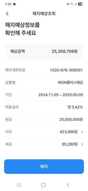 오늘 은행 예금 만기인데 이자가 네이버에는 70만원 나오고 해지할 때는 30만원 나오는데 왜 다른가요? 제가 잘못 계산한 건가요?