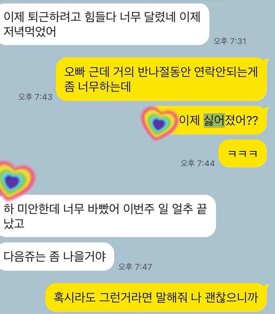 - 연애·결혼고민상담탈퇴한 사용자오빠가 저에 대한 마음이 뜬 걸까요??오빠가 저에 대한 마음이 뜬 걸까요?? 카톡이 반나절 이상 없어서 마음 뜬 건지 싶어서 물어보니 그건 아니래요.. 마음떴는데도 아니라고 하는 경우도 있나요?5명이 답변했어요